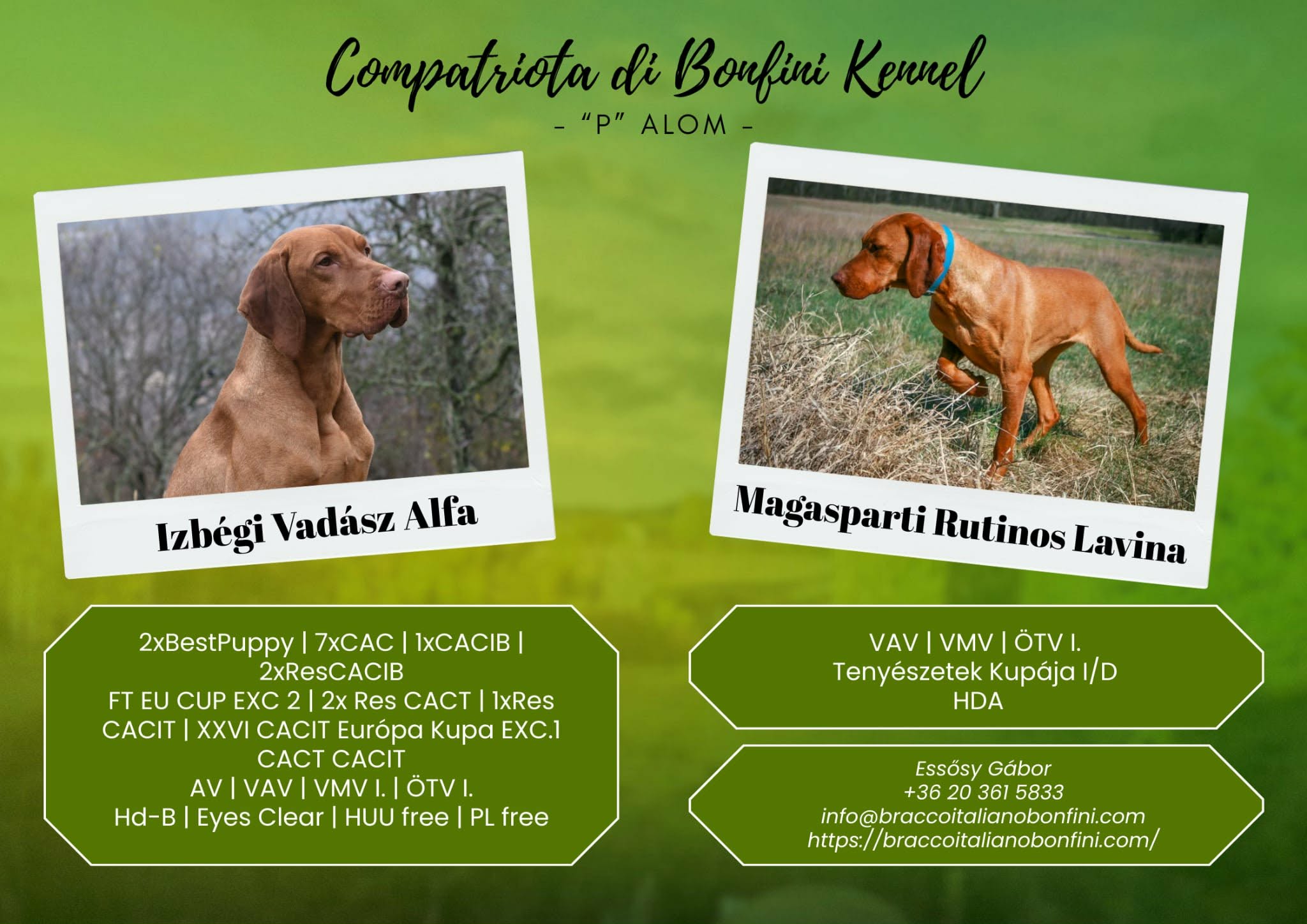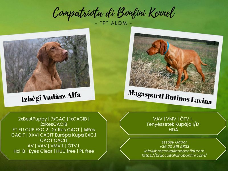 Our kennel's goal is to breed great looking and well working (hunting) Bracco Italianos. All our dogs have gone through skill tests and are screened for hip dysplasia. Although we place an importance on their ability to be great hunters – dogs from our kennel don't need to be kept as hunting dogs – you can own a perfectly happy Bracco even if you “just” take them for walks or play sports with them. They can be kept indoors, outdoors or in a kennel but the closeness of their owner is what's most important to them. Our dogs are kept in kennels with a long stretch of running area. In addition to excercising them regularly with walks, biking and swimming - in hunting season we also join huntsmen in search and fetch missions. We make a special effort to choose puppies for our future customers based on the personality and looks of the puppies. It's very important for us that these dogs find good homes and that the new owners are happy with their new puppies. We have a great relationship with the most of the Bonfini- customers abroad and in Hungary and appreciate all feedback on the dogs, their awards or any other Bracco-related topic. I bought my first Bracco, Norma, with my wife in Holland. We met her breeder Karel J. Labberté in the 1996 Budapest World Dog Show, with whom we have a great relationship ever since. My wife – speaking 3 languages – keeps contacts with our foreign partners. With our three children we live only a few kms from Tata in a little village called Naszály, which is easily accesible from anywhere: driving on M1 only 7 minutes from Exit Tata.
