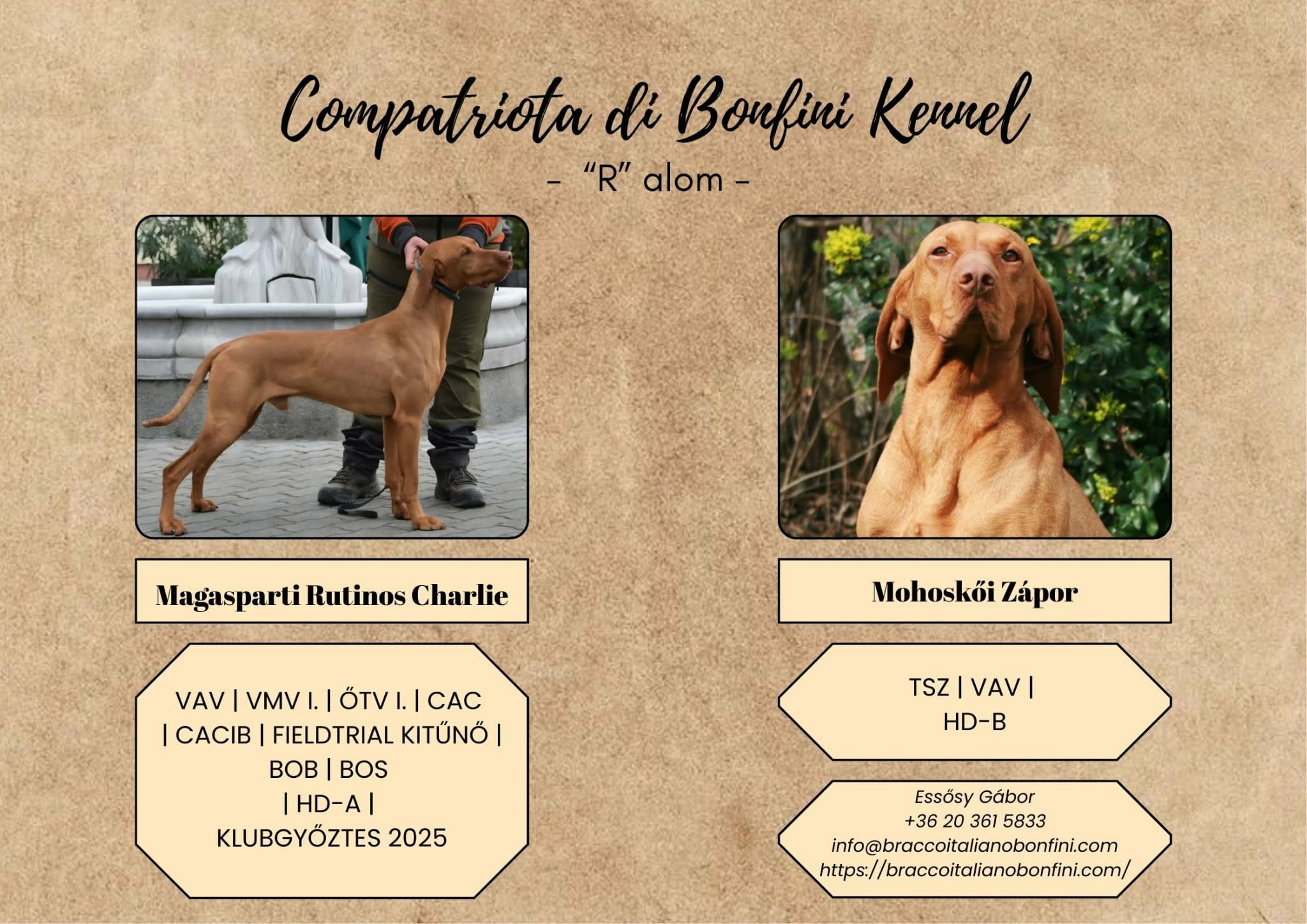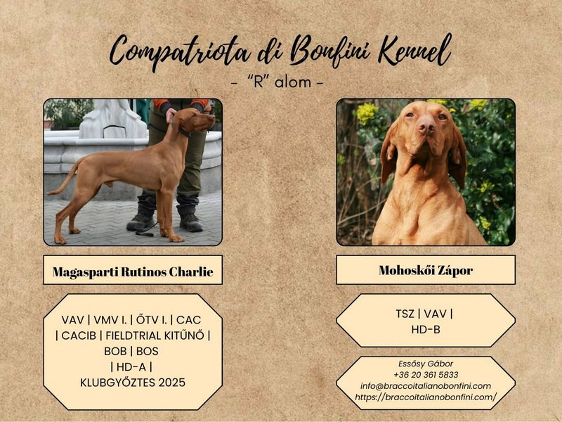 Bracco Italiano represents the seventh group along with setters and other kind of pointers and the Breton spaniel. Since Italy is fairly large in size, there are many varieties in different regions of the country. These differences are represented in bone structure, size and in the skin of the skull but the expert eye can also spot the differences in the upper and lower line and facial expressions. Although most of the judges in Hungary have a very good understanding of the Bracco Italiano, we think it's important that our dogs get measured up in Italy too. Being a member of the hunting dog jury of MEOE (FCI) I am often requested as a judge in examinations and trials.