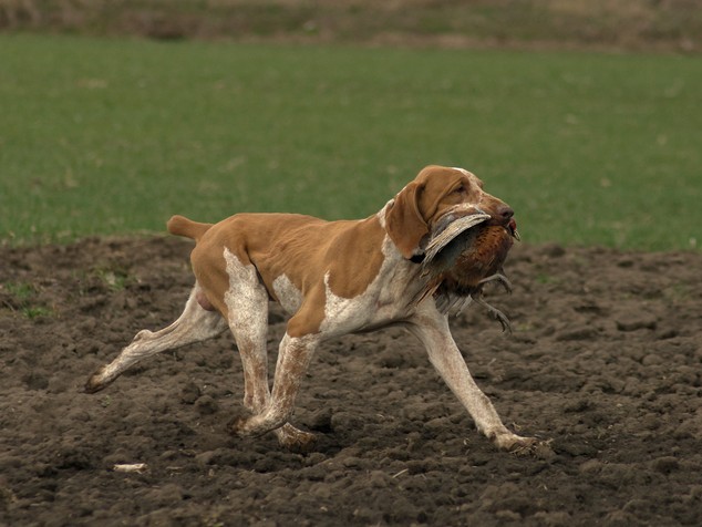 Outside Italy the significance of the Bracco as a hunting dog is small. Although it's considered the ancestor of many European pointers, its work style is very different. It has a great ability to work as a hunting dog (field, water and forest) but what makes it interesting is its work in fields. The gait in the field is not the gallop but a trot while searching the wild and on the scent. Equipped with a great nose, persistence and meticulousness the Bracco doesn't tire or lose speed after a long day of hunting. He is also adept at sensing flocks, and works eagerly in difficult terrain. Since they have a high tolerance for pain they don't spare any effort to get the job done. Like with every hunting dog, great emphasis has to be put on obedience. Our Bracchi work equally well in water too: they've proven it many times over when pursuing a fallen duck or fetching a bleeding bird from the middle of a lake.
